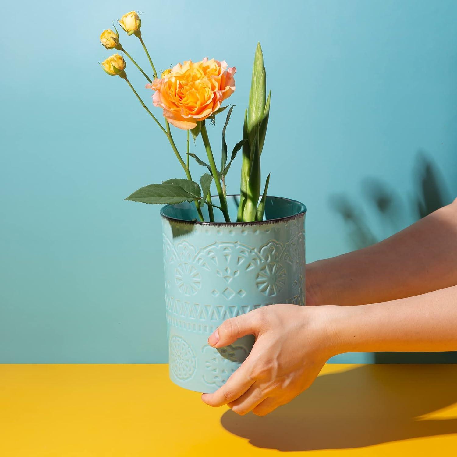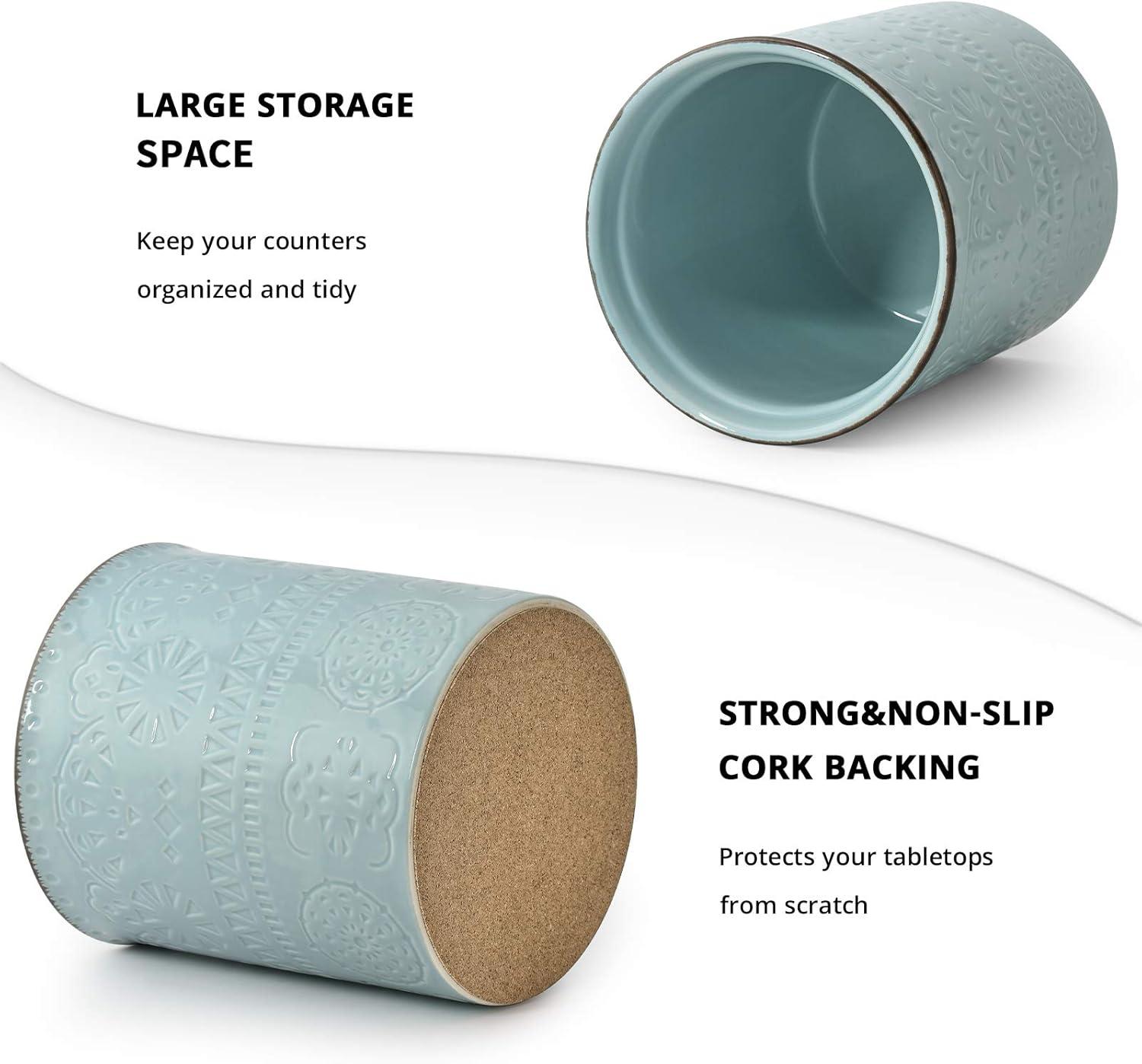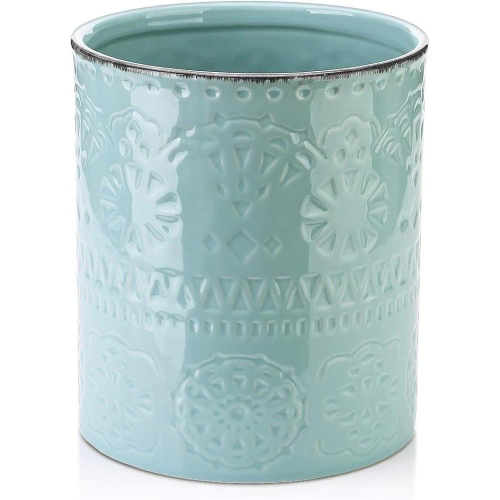 Farmhouse Style Fitting Any Home Déco:This classic farmhouse utensil holder with embossed style adds a vintage touch to your home décor. And it is a splash of color to your countertop.(Utensil holder for kitchen counter)